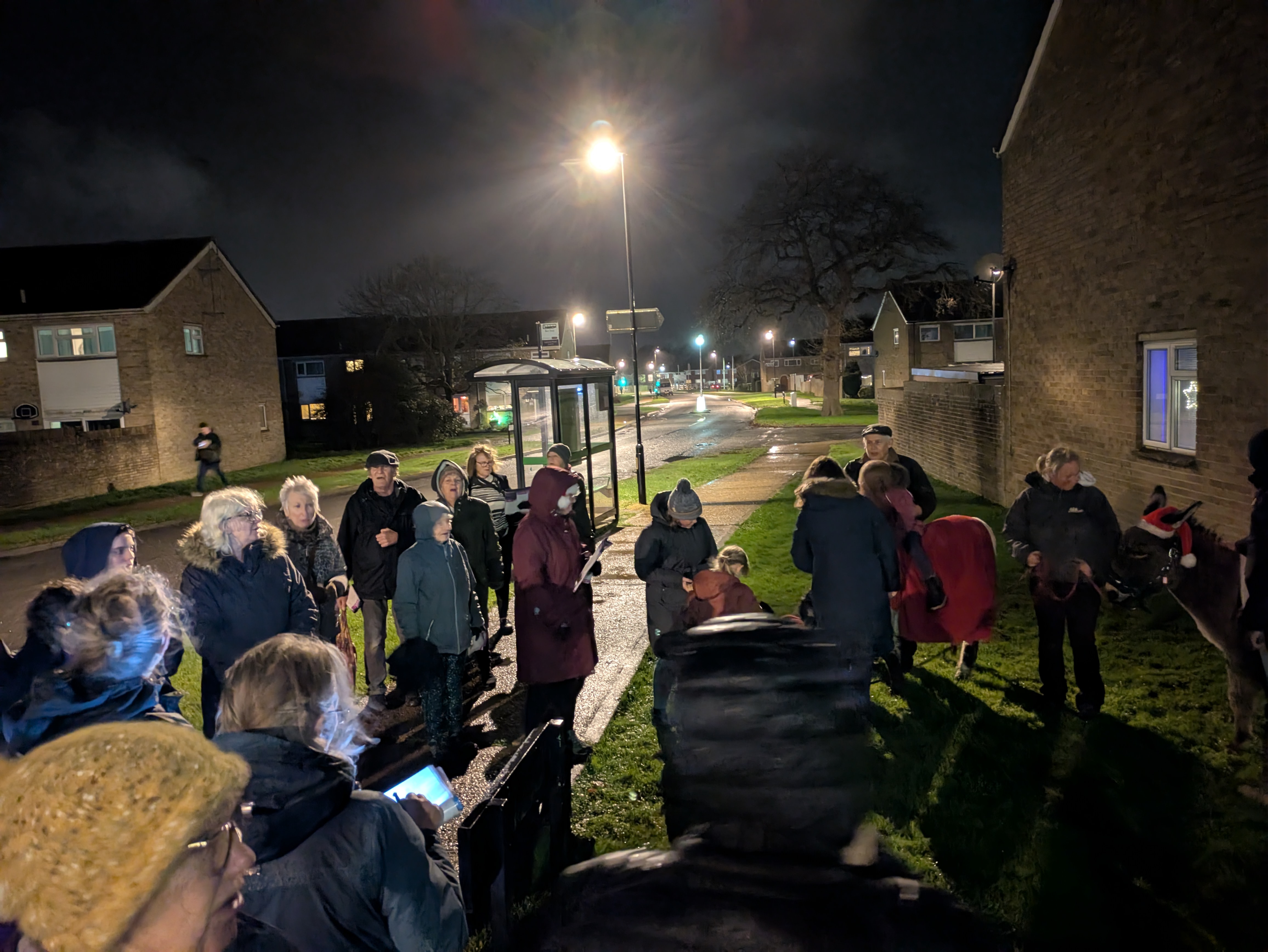 Carol Singing with two Christmas donkeys at Brookleigh, Sheddingdean and Burgess Hill Football Club.