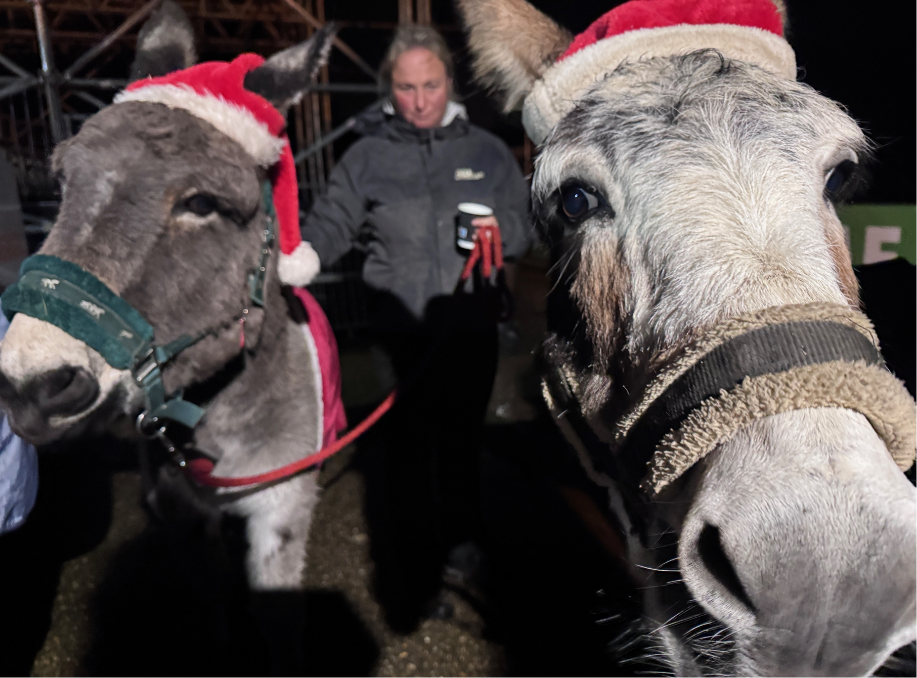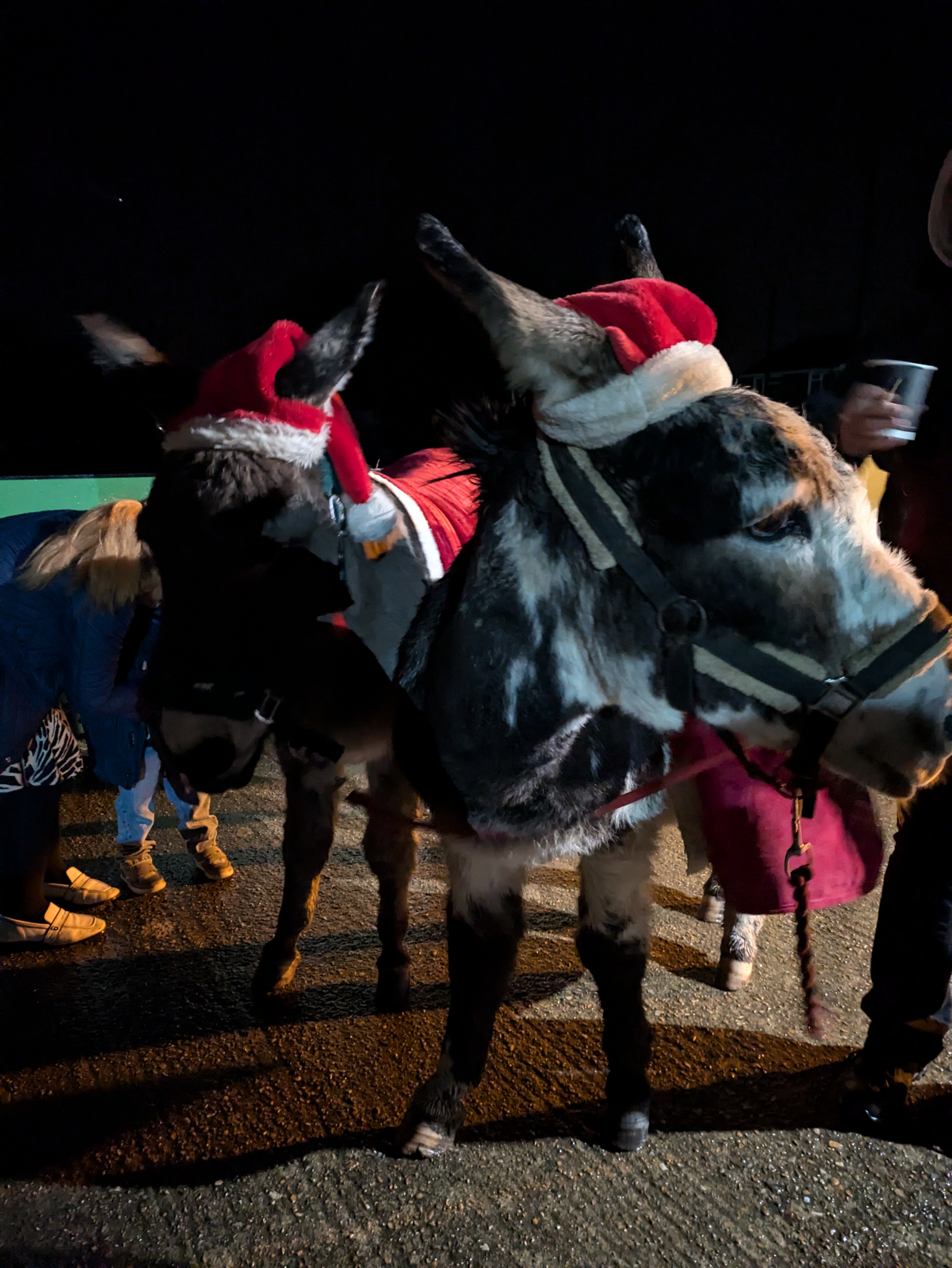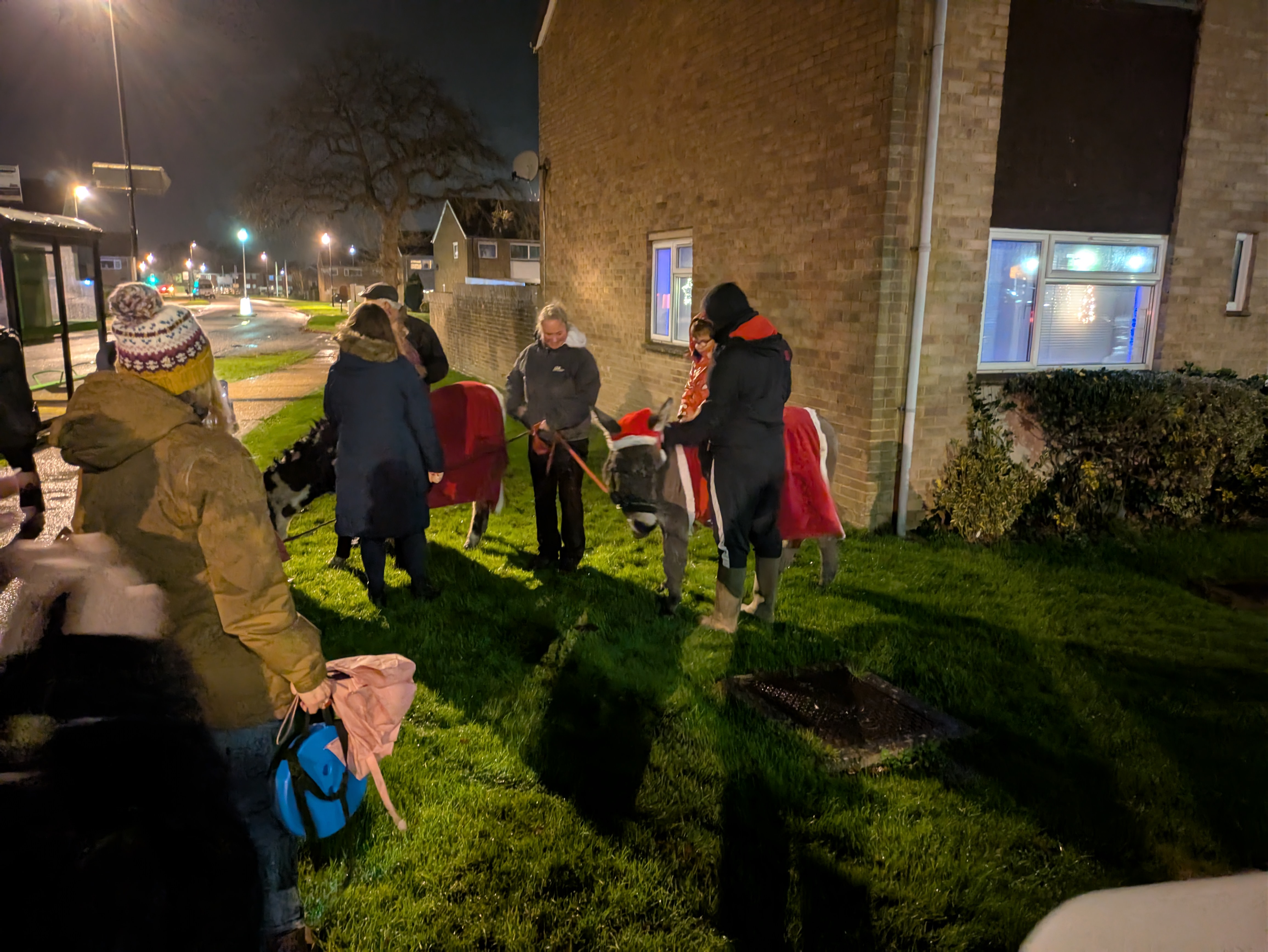 Carol Singing with two Christmas donkeys at Brookleigh, Sheddingdean and Burgess Hill Football Club.